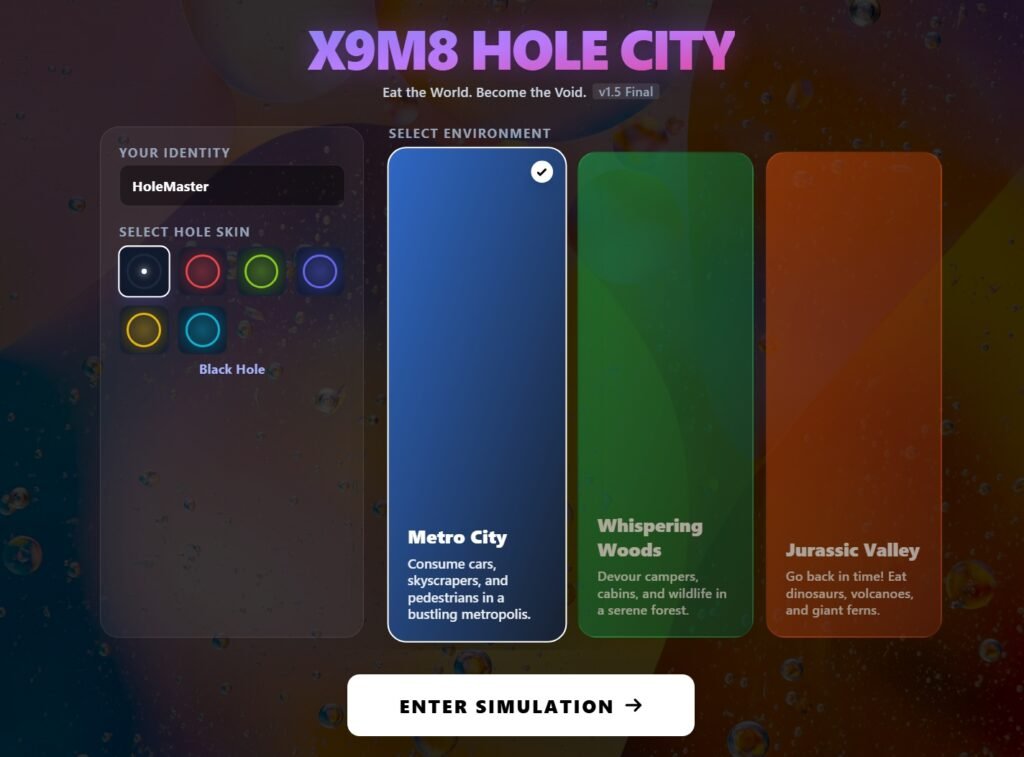 Enter the chaotic simulation of X9M8 Hole City. You start as a small anomaly in the fabric of reality with one singular goal: consume everything in your path. Race against the clock and aggressive AI competitors to swallow the map whole.